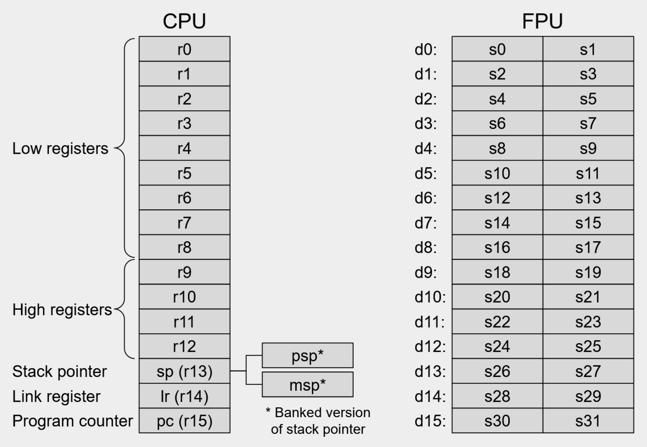 The concept of register balancing is important for any architecture but vital for microcontrollers, due to the combination of few and small registers. This architecture uses sixteen 32-bit registers, thirteen of which are general-purpose registers.